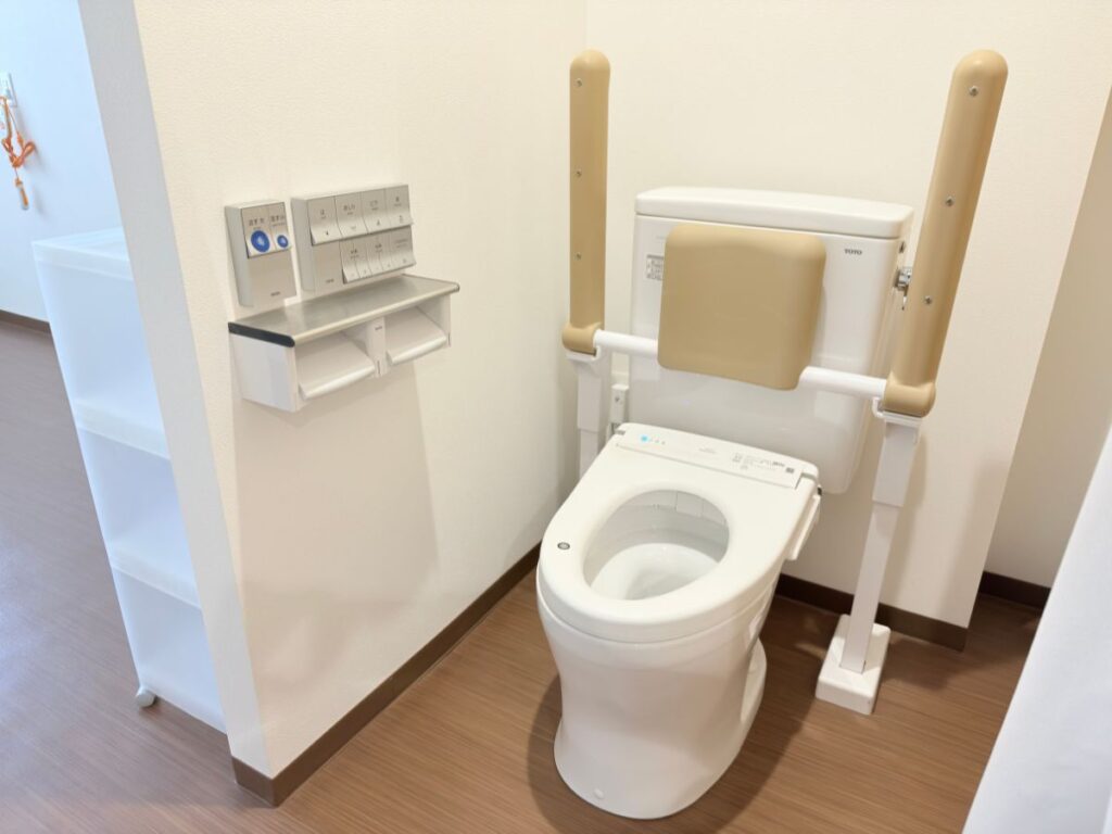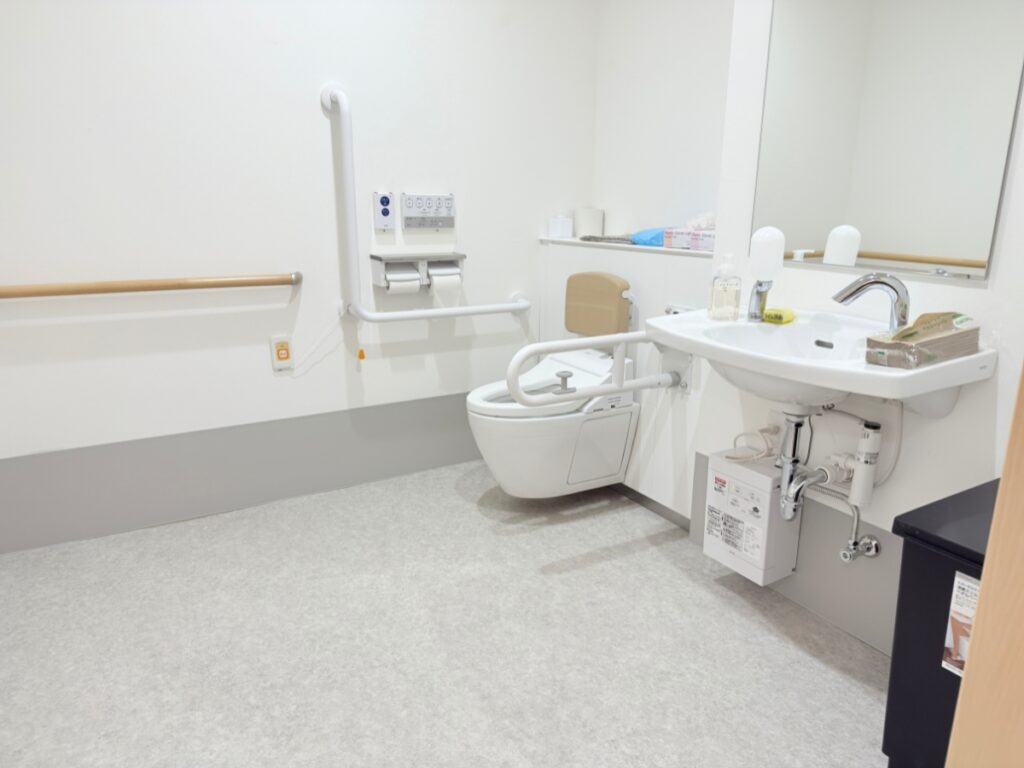 広い空間と手すりが設置されたお手洗いで、車いす利用者の方も悠々と使っていただけます。